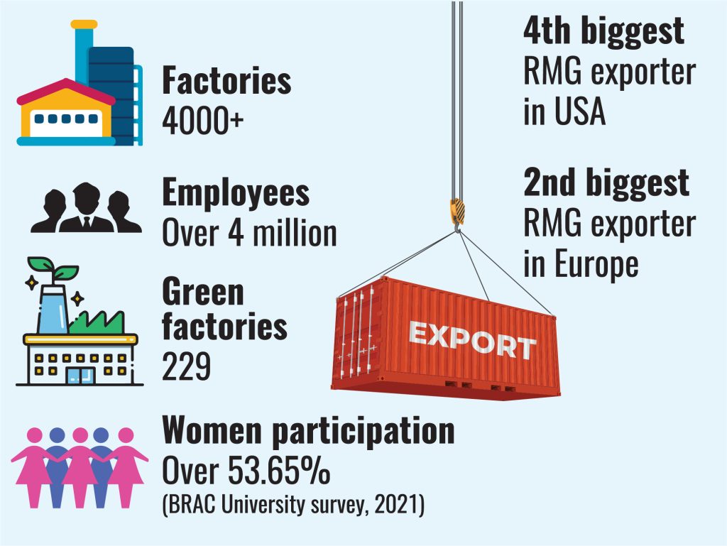 There are currently over 4,000 factories in the industry. RMG exports a wide range of knitwear and woven textile goods from Bangladesh, such as shirts, slacks, T-shirts, jeans, jackets, sweaters, and more.