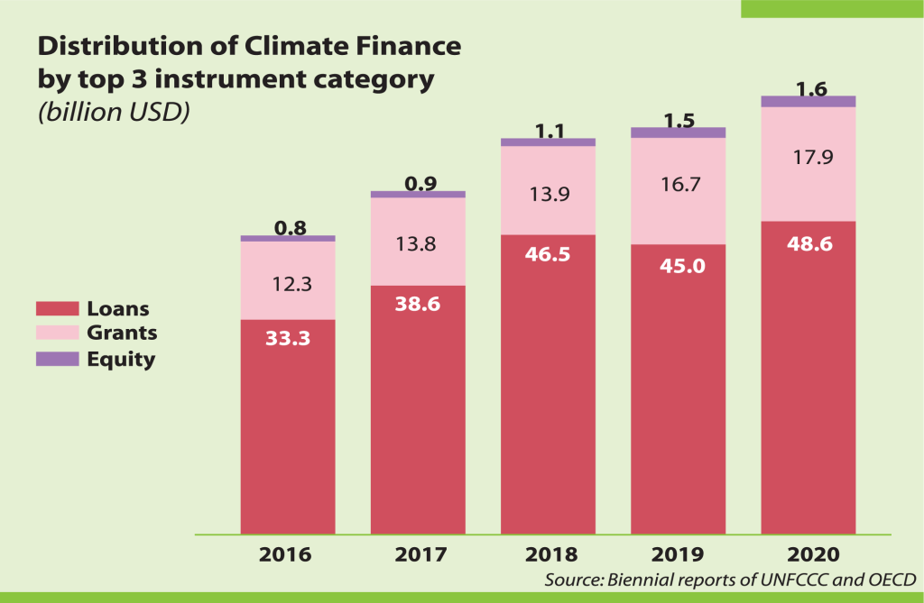 But Oxfam puts the number much lower, at around USD 19-22.5 billion (2016-17). This discrepancy is primarily because a significant portion of those funds was loaned out at the standard market rate. So it shouldn’t be counted as climate financing, they justified. We should note that the funds given as standard loans have to be paid back with interest, leaving little space for developing countries to implement projects that help with adaptation.