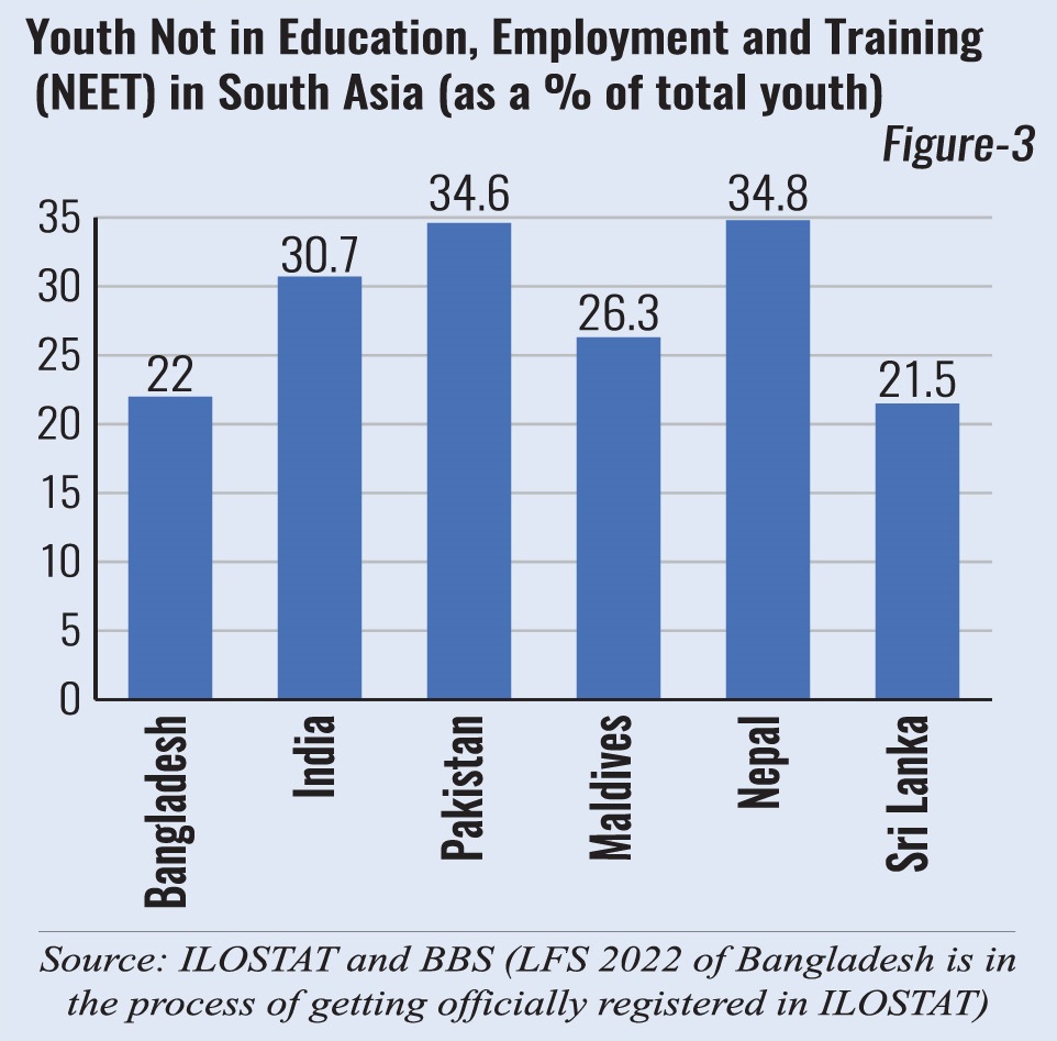 Another important area that Bangladesh’s enterprises, businesses, and investors must emphasize as a top priority is engaging youth in training and scopes for finding jobs. The number of youths not in education, employment, or training (NEET) is massive. However, Bangladesh is doing well compared to the South-Asian neighboring countries, with 22% of the total youth NEET (Figure 3). Nevertheless, the Youth NEET is a big challenge for Bangladesh to overcome as the total youth NEET population is still huge, and underutilizing the demographic dividend the country has been enjoying in the last decade is becoming a lost opportunity for the country.