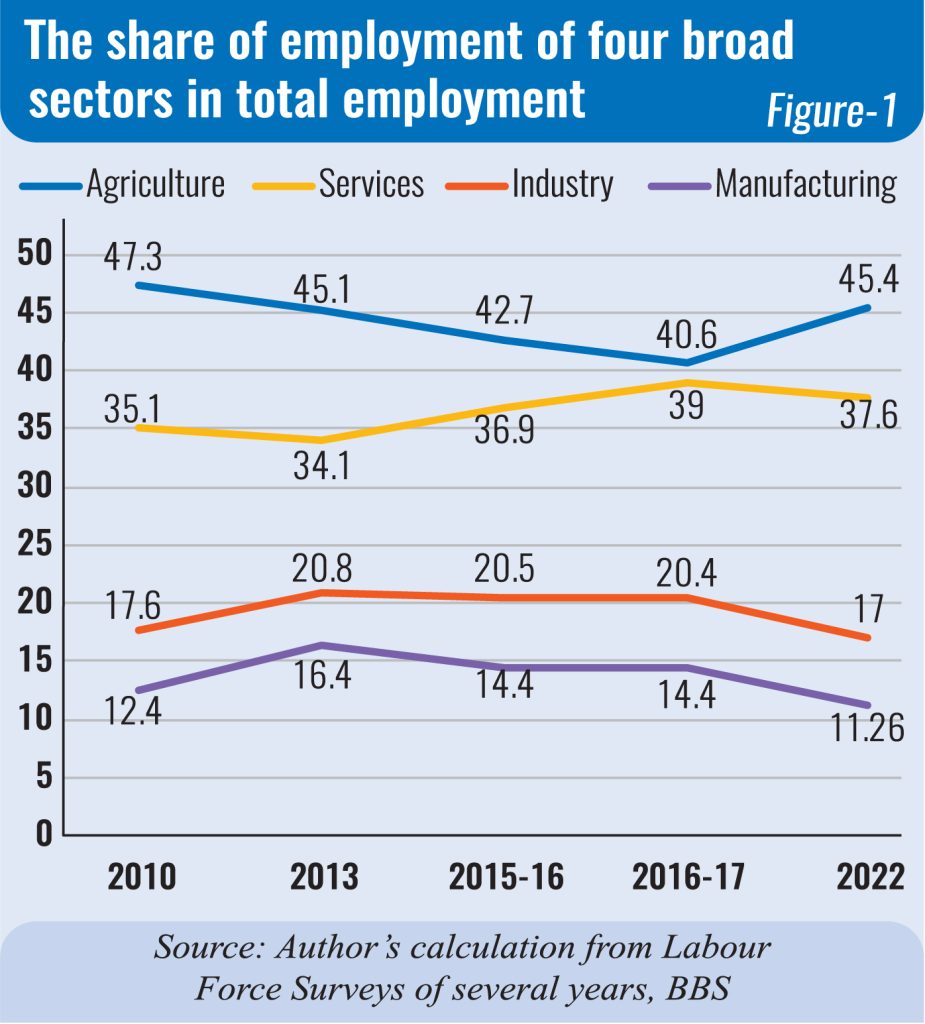 Trends of labor share in the broad sectors can provide insight into how Bangladesh has been performing in terms of job growth and manufacturing industries. Bangladesh’s workforce has traditionally engaged in primary sector activities. While the country undergoes a structural transformation, transitioning from agriculture to manufacturing and services, the agriculture sector still commands the largest portion of employment. Surprisingly, despite a steady decline in agricultural employment as a percentage of total employment from 2010 until 2016-17, there was a reversal in 2022 as of the Labor Force Survey 2022. The share of agriculture in total employment decreased from 48.1% in 2006 to 40.6% in 2016-17, then to increase again in 2022 (Figure 1).