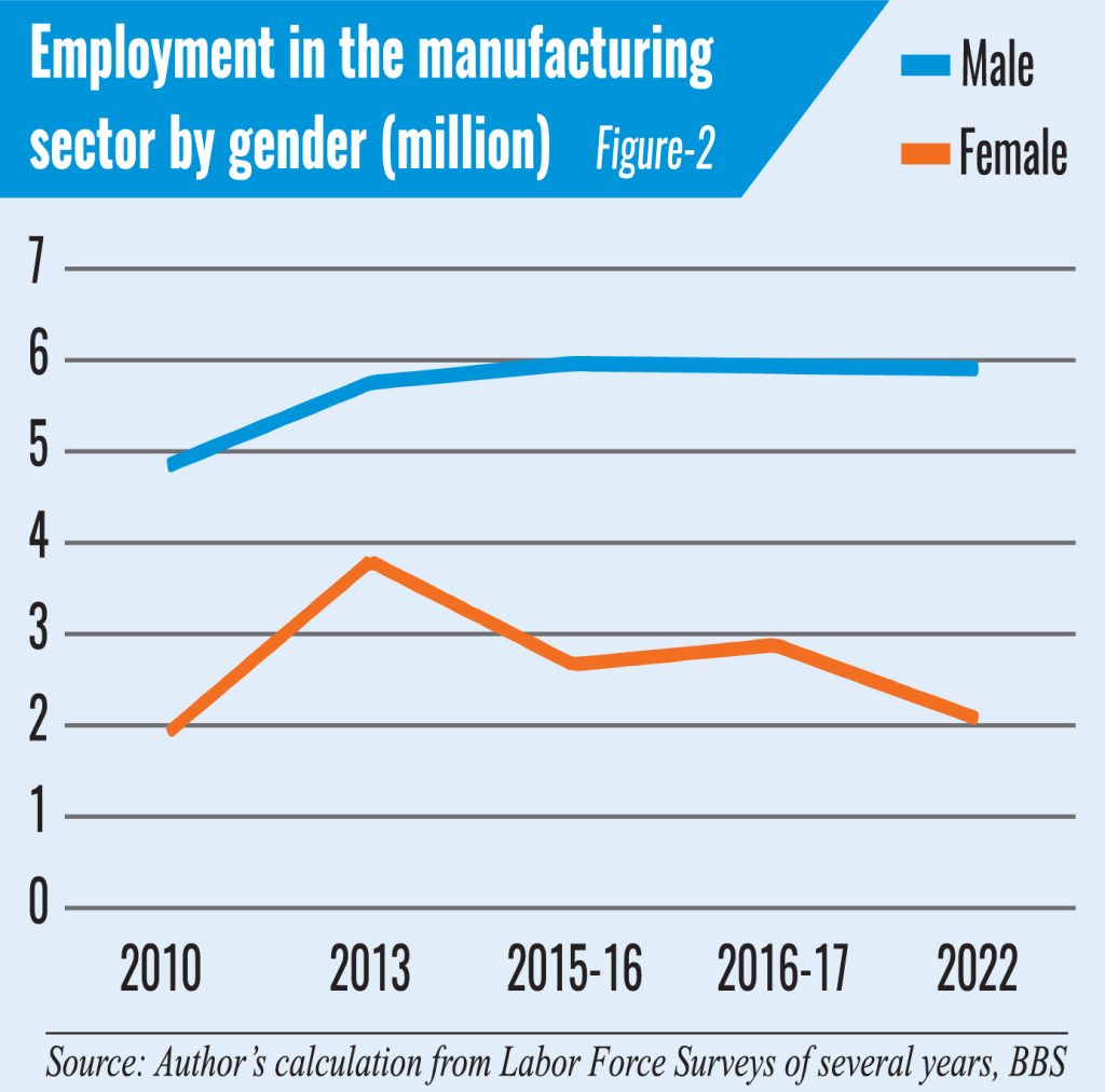 Bangladesh witnessed a remarkable increase in the share of female workers in the manufacturing sector, driven predominantly by the rising number of women employed in the ready-made garment industry, comprising 75-80 % of the workforce. Nonetheless, recent trends suggest a great defeminization of female workers in the manufacturing sector. The share of females in the manufacturing sector declined from around 40 % in 2013 to 26 % in 2022 (BBS). A significant reduction in female participation was experienced in all major sectors, including apparel, textile, food products, tobacco, etc.