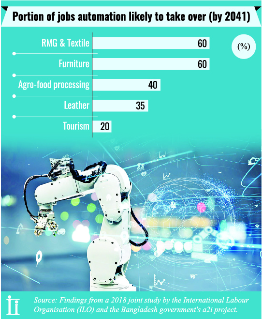 The International Labour Organisation (ILO) and the Bangladesh government’s a2i project jointly conducted a study in 2018. It revealed that by 2041, some 5.38 million jobs will be at risk in five key areas of Bangladesh due to automation in the industries and services sector.