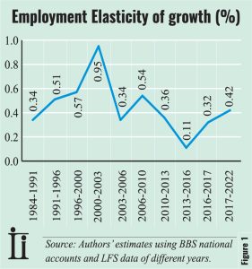 The employment elasticity of growth witnessed a big fall from close to 1 % in the early 2000s to just 0.12 % during 2013-16 (Figure 1). Subsequently, it rose to 0.32 from 2016 to 2017 and continued its upward trajectory, reaching 0.43 during 2017-2022. It is clear that the employment elasticity of growth in Bangladesh is still low, sluggish, and inconsistent.