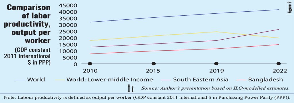 Figure 2 demonstrates Bangladesh’s poor labor productivity compared to the regional and global average.