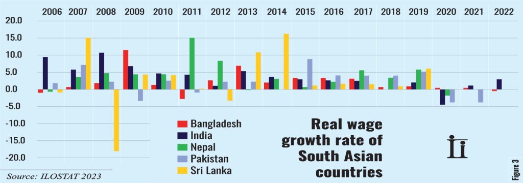 Figure 3 depicts the growth rate of real wages in Bangladesh compared to other South Asian countries. Bangladesh’s real wages have either grown negatively, declined, or grown insignificantly. This has socioeconomic implications, as there is an increasingly large share of working poor people and also a deficit of decent work for the employed population with poor living standards.