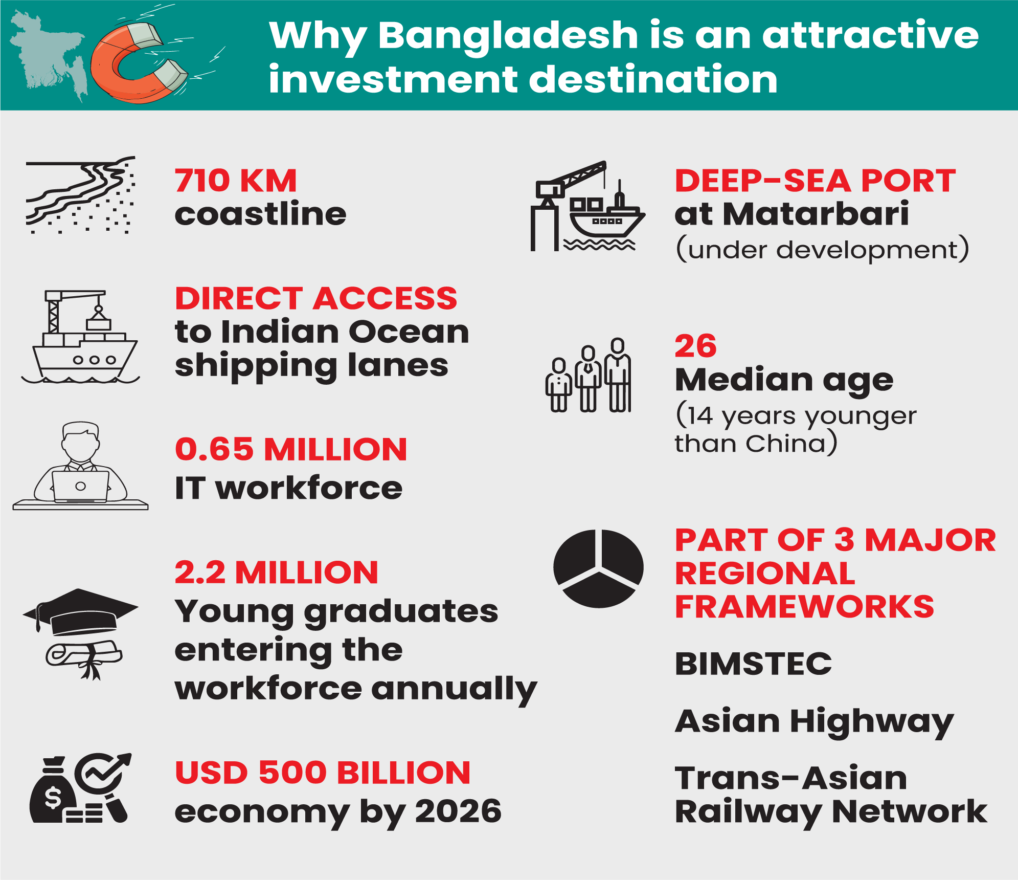 These multi-dimensional efforts are all aimed at turning Bangladesh into one of South Asia’s most competitive and trusted investment destinations.