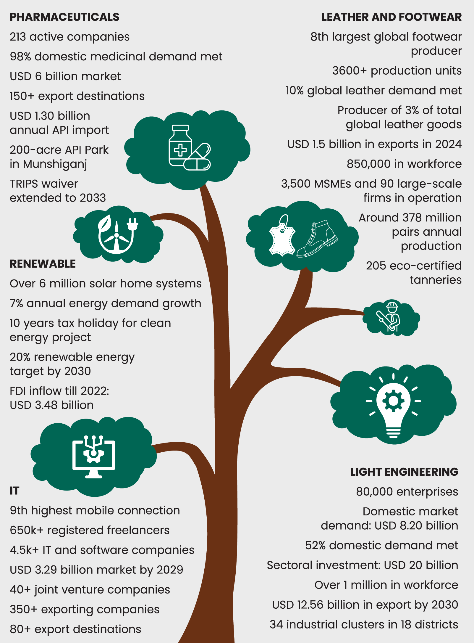 • Electronics and Light Engineering: Bangladesh has begun receiving investments from countries like China and Japan. With growing capacity, this sector has the potential to become a major export earner for the country.
