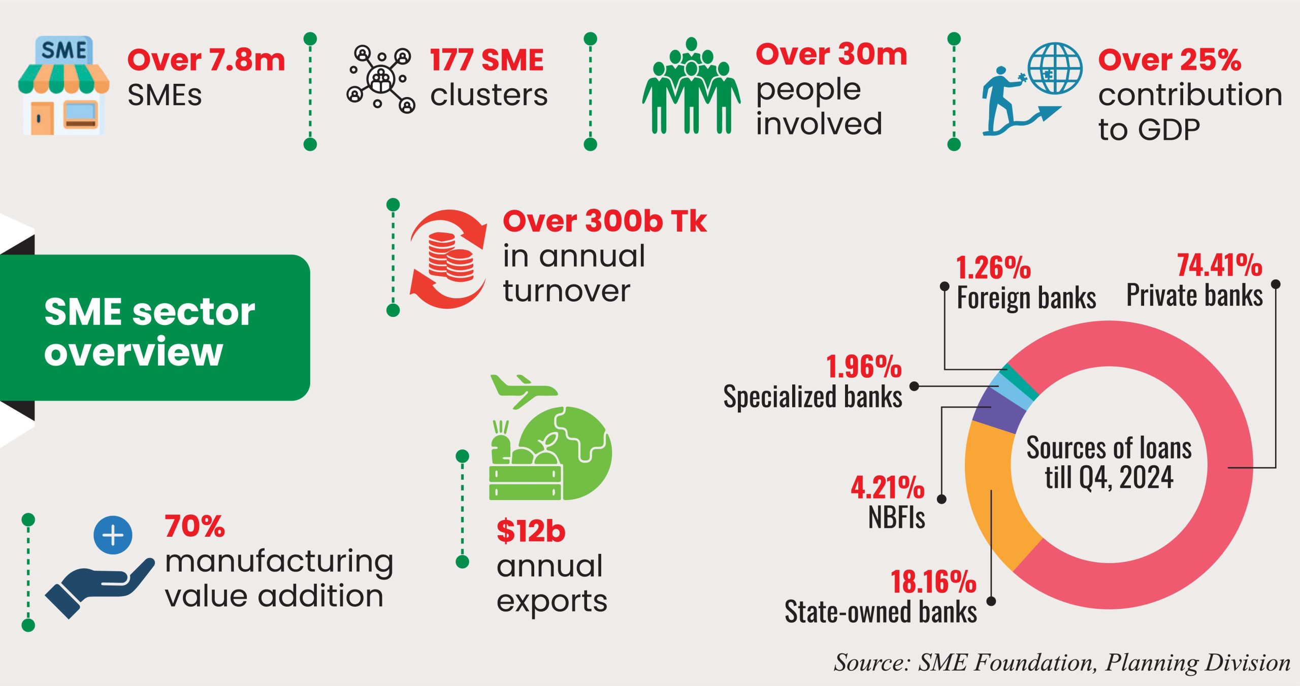 In Bangladesh, MSMEs face two major hurdles: high utility costs and a risk-averse tendency in lending. MSMEs are charged higher electricity rates compared to large industries, which actively discourages investment in the sector. Banks also view SMEs as risky ventures, giving preferential treatment to medium and large enterprises during the loan application process.