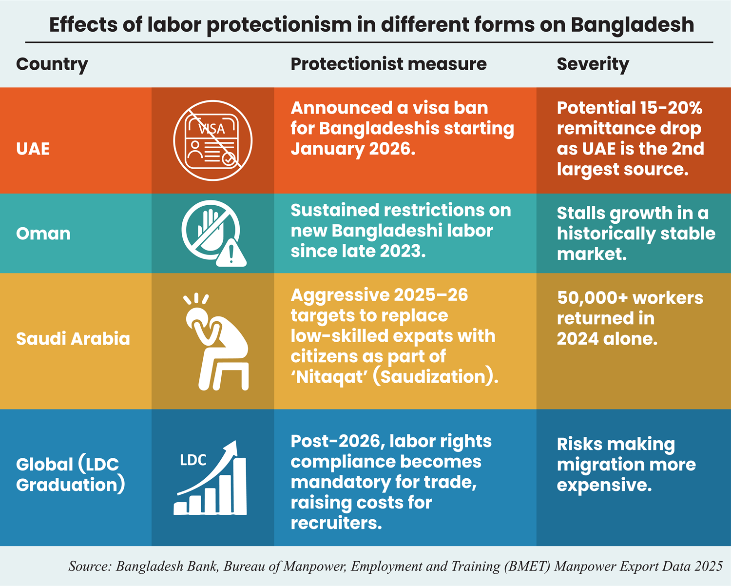 Although the USA’s labor protectionist measures will have minimal impact on Bangladesh, the country is a trend setter, and the world follows it. So, Bangladesh and other developing nations that depend on labor exports will be affected by protectionist trends.