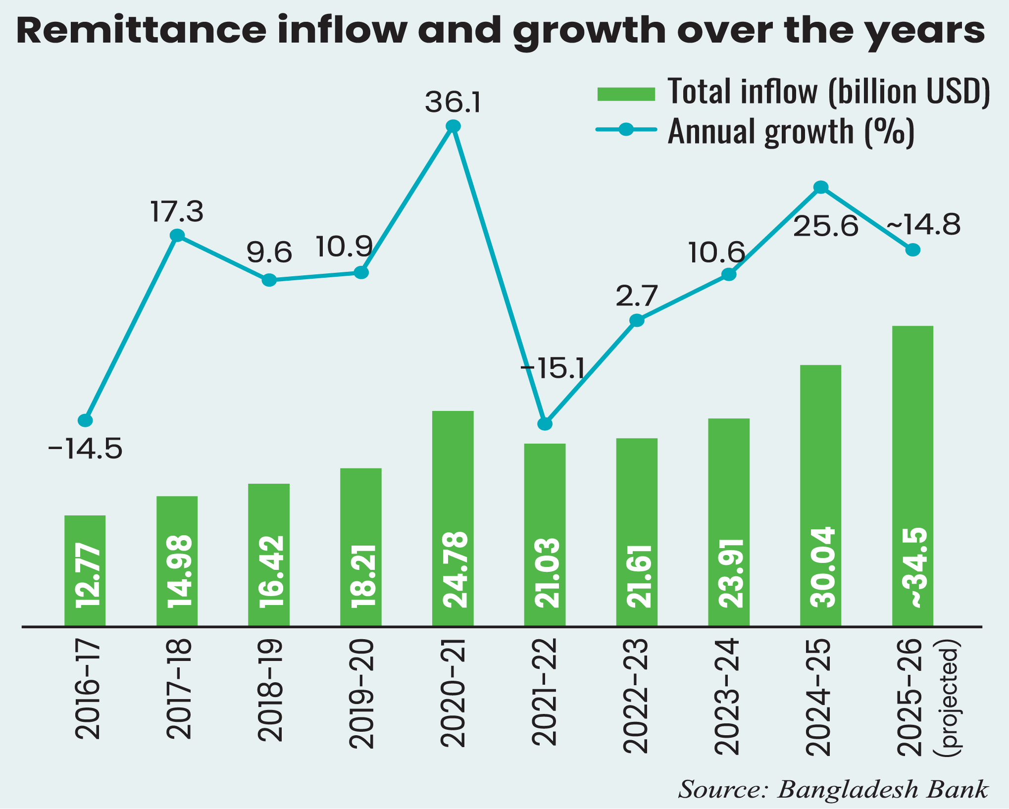 Remittance inflows to Bangladesh rose to an all-time high of $32.82 billion in 2025, driven by the expansion of digital and banking channels, which made them easier to use, the seasonal tendency for immigrants to send more money in December, and various cash incentives for remitters.