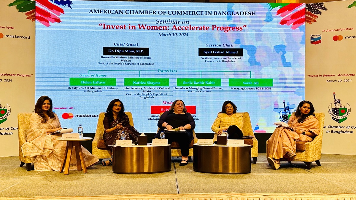 Held in conjunction with International Women’s Day, the seminar featured remarks by Dr. Dipu Moni, Minister of Social Welfare, followed by a panel discussion moderated by Oracle Bangladesh Managing Director, Ms. Rubaba Dowla. Besides Chargé d’Affaires LaFave, the Panel included Ms. Nafriza Shayma, Joint Secretary (Archeology and Museums), Ministry of Cultural Affairs; Ms. Sonia Bashir Kabir, Founder and Managing General Partner, SBK Tech Ventures and Ms. Sarah Ali, Managing Director, FCB BITOPI.