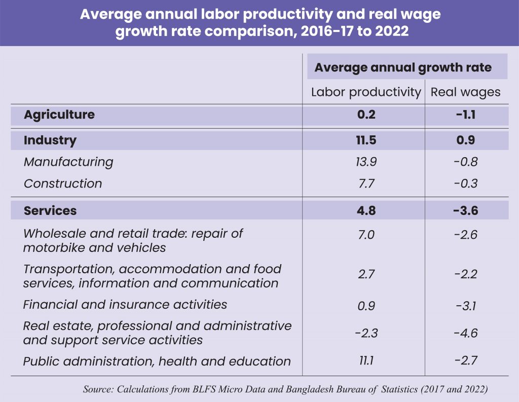 One indicator, labor productivity, compared with real wages, is useful for understanding how workers in a country are being exploited and facing the ‘low wage trap.’ Below is a table showing Bangladesh’s case.