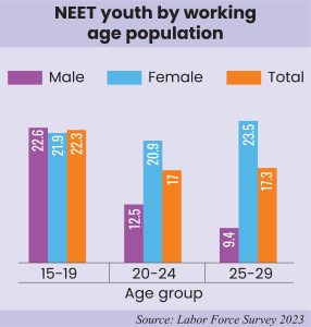 If anyone observes Bangladesh’s NEET youth, they are around 30%, largely influenced by females. According to ILOSTAT, the labor force participation rate stands at 49.5%. Alarmingly, the NEET rate has reached 30.9%.