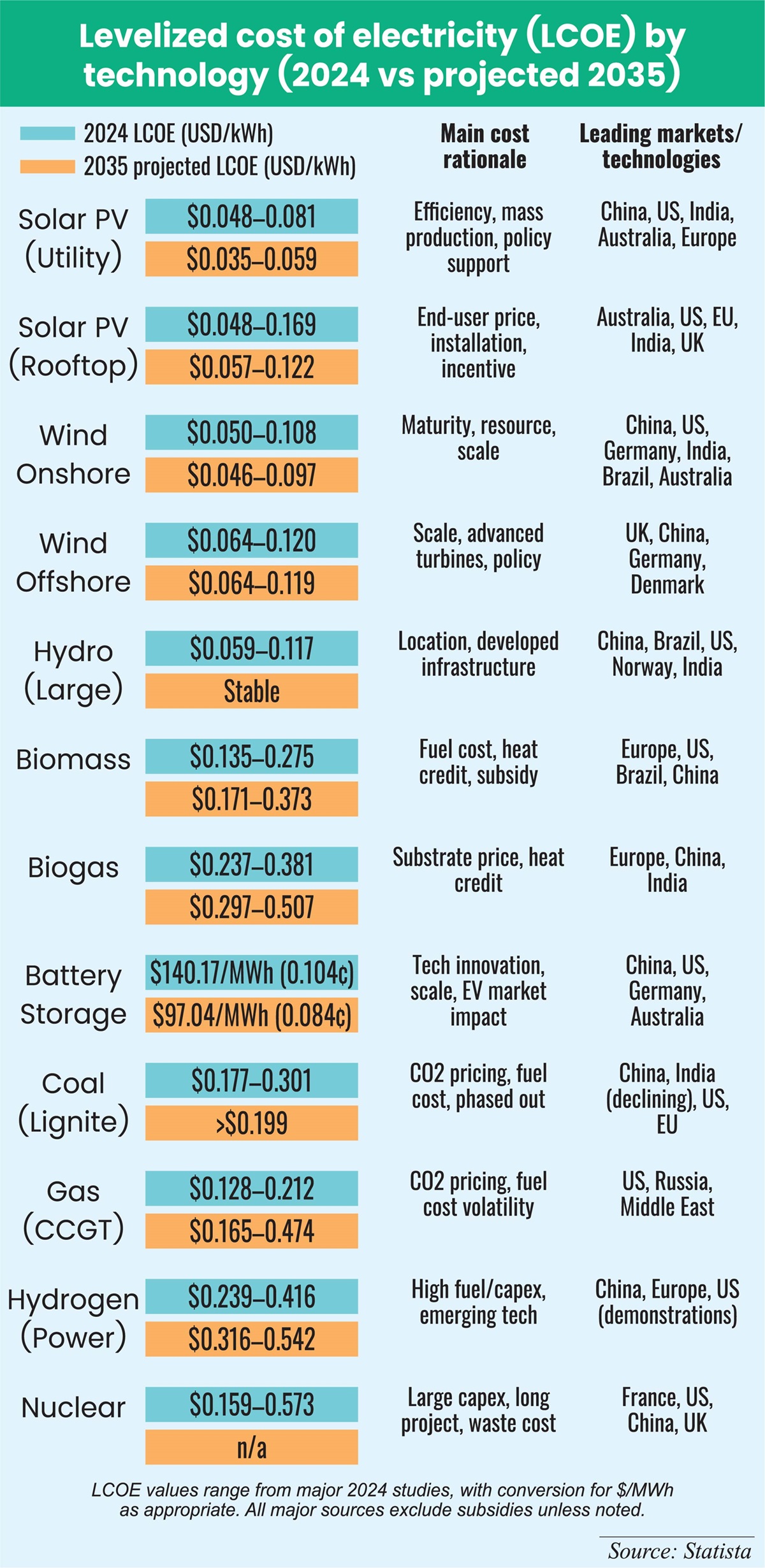Hydrogen power is in an early phase, with LCOEs of $23.87–$41.65 cents in 2024, rising to $31.59–54.17 cents by 2035. Unless production and storage costs fall, hydrogen will remain a supplementary, not primary, source.